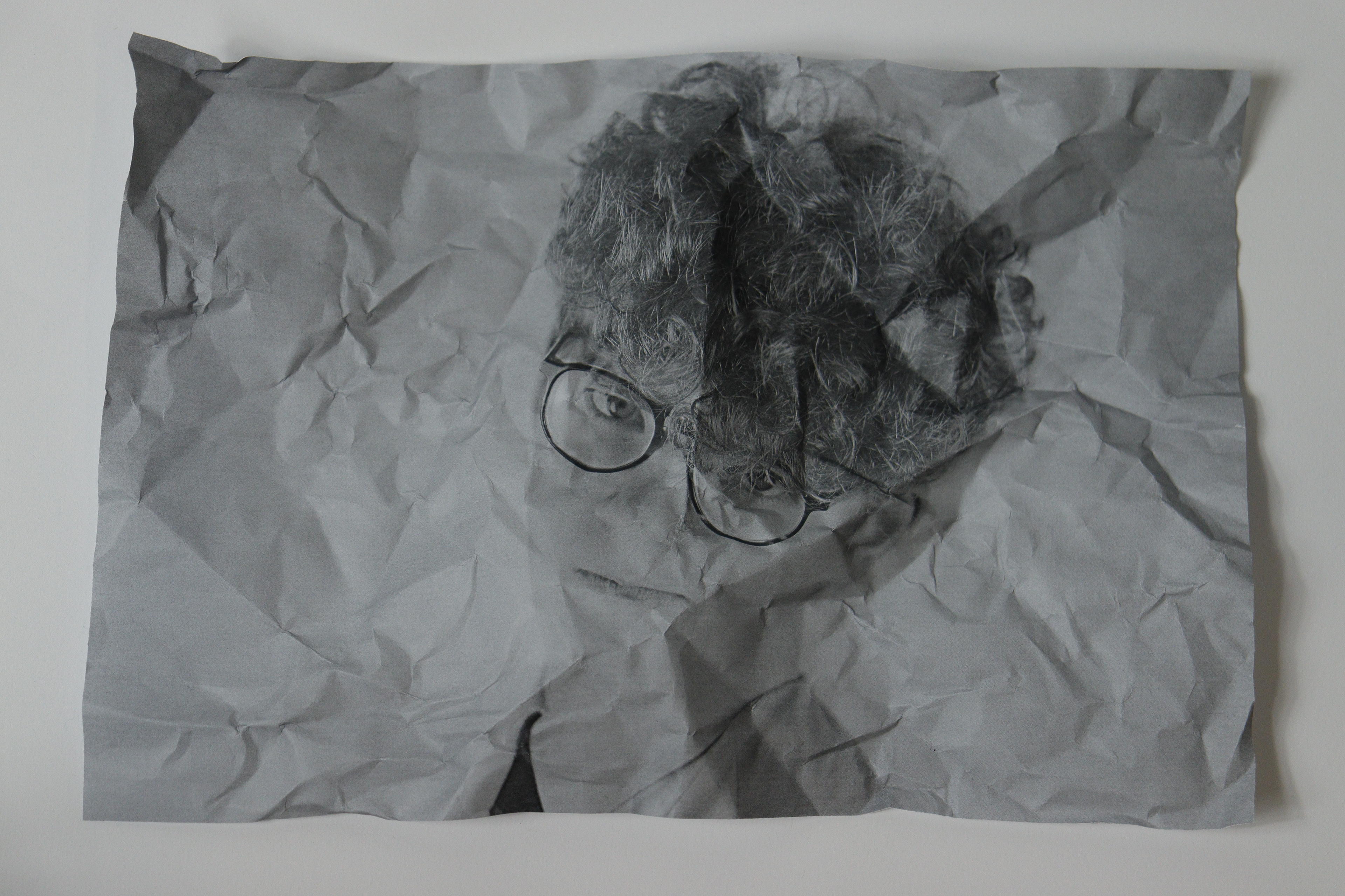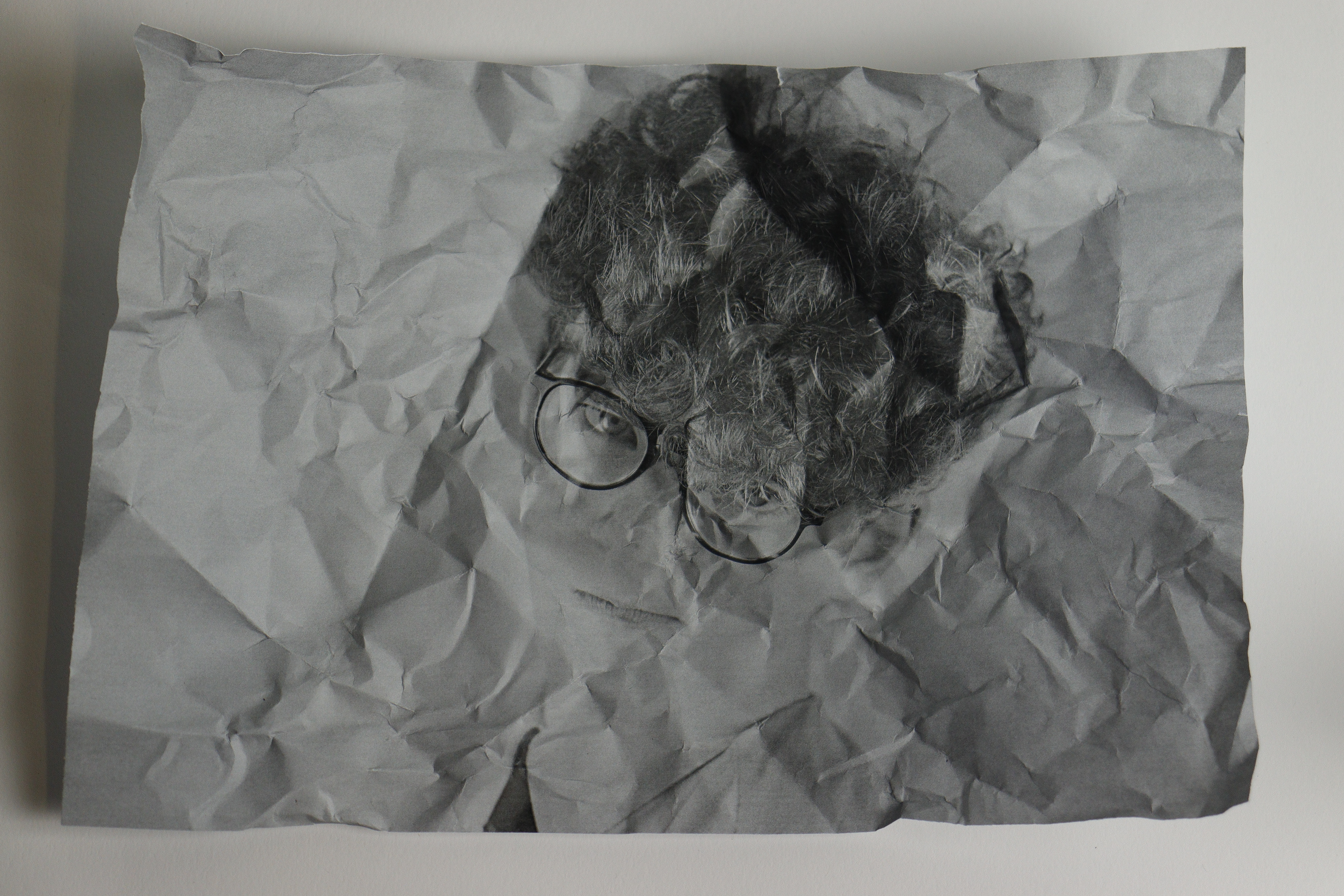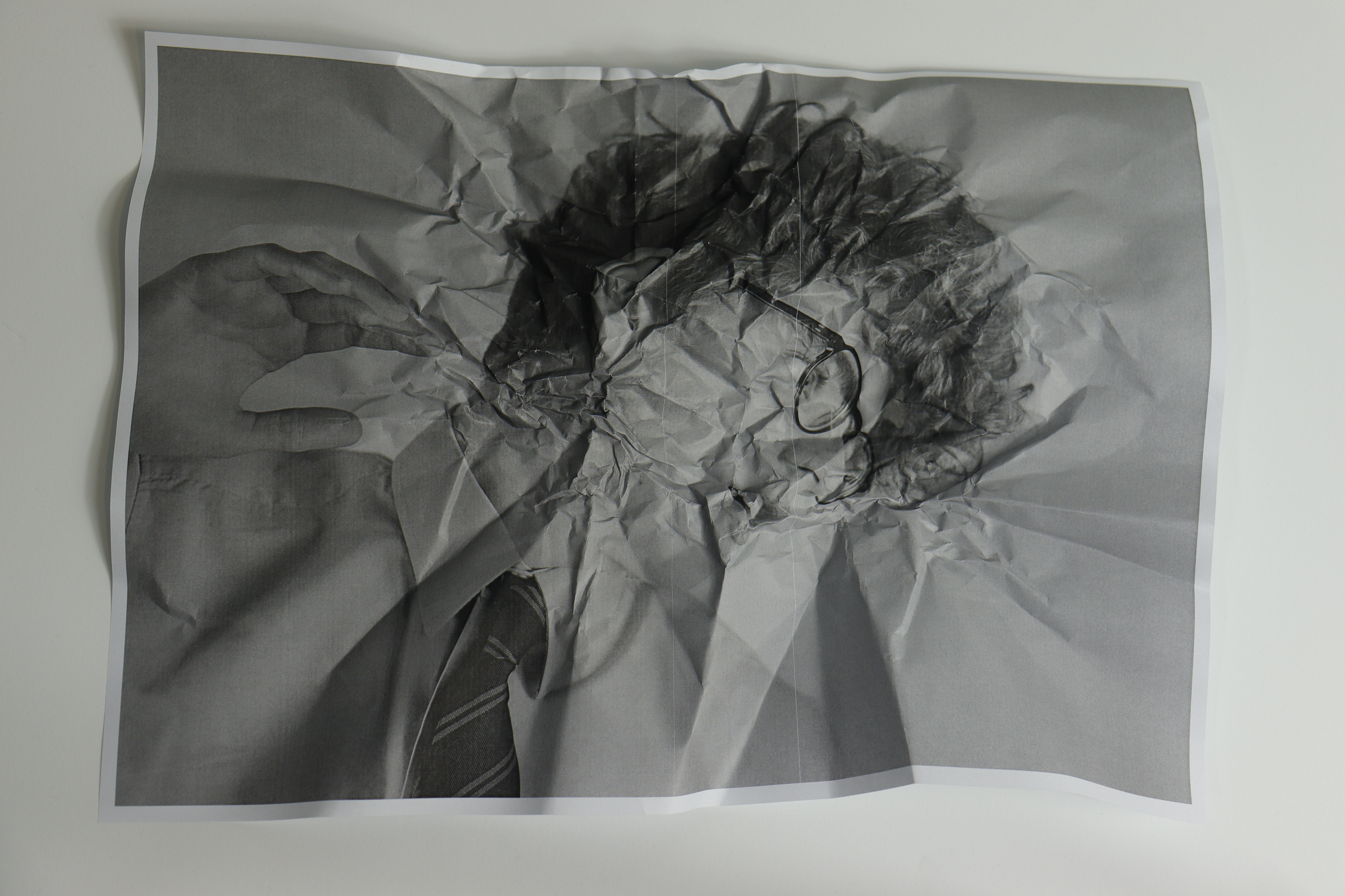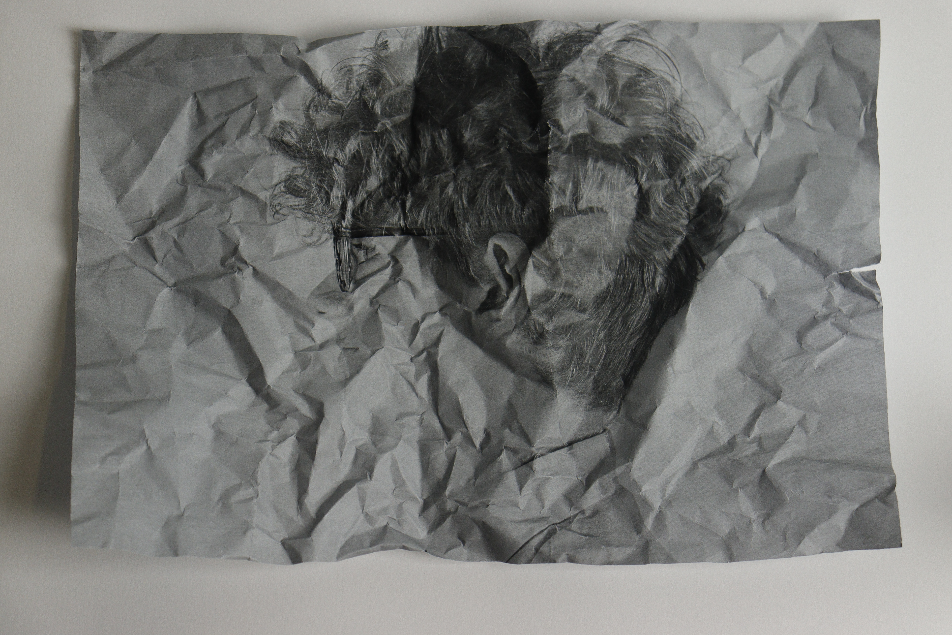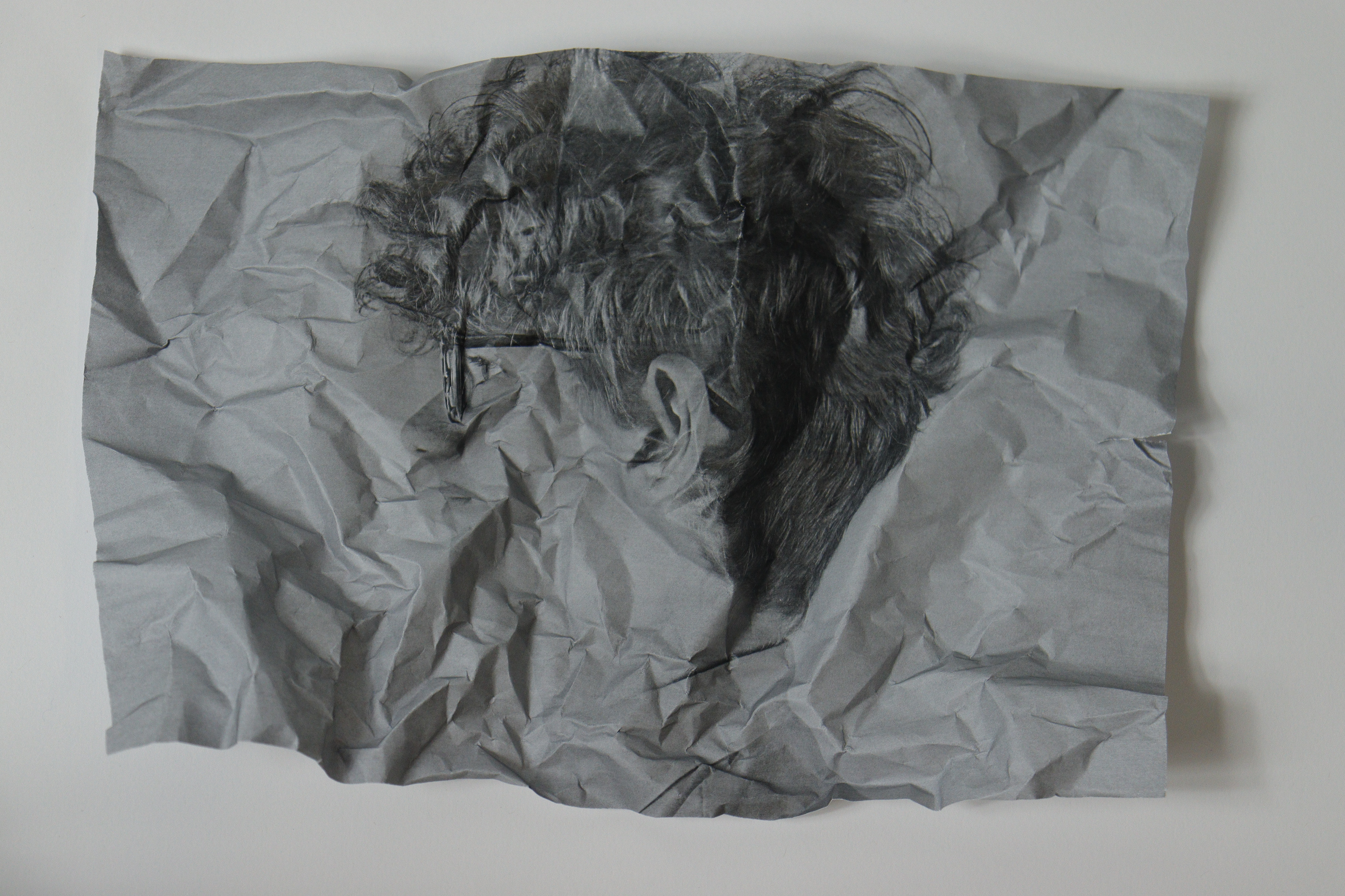The works have a simple composition: The subject is in the centre and is often placed against a dark or black background. This sharp contrast helps draw your attention to the subject and serves to highlight the crumples in the paper. These crumples create a very interesting texture which plays a key role in the distortion of the image.