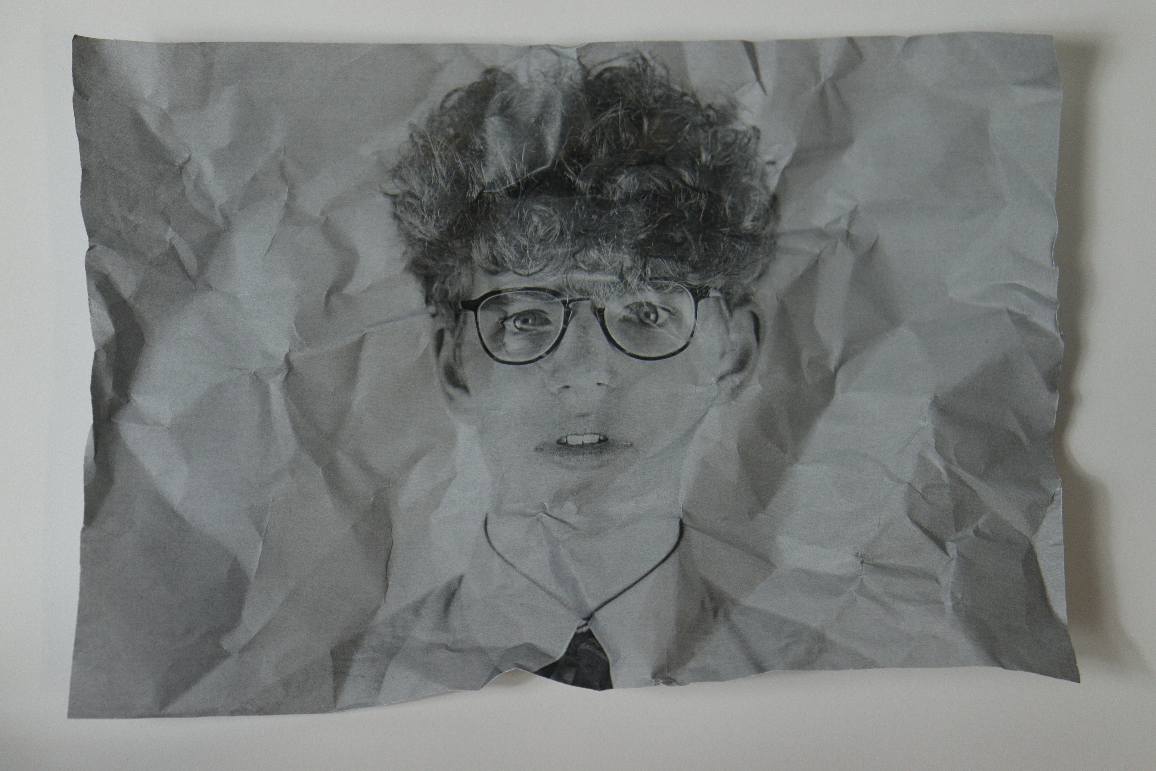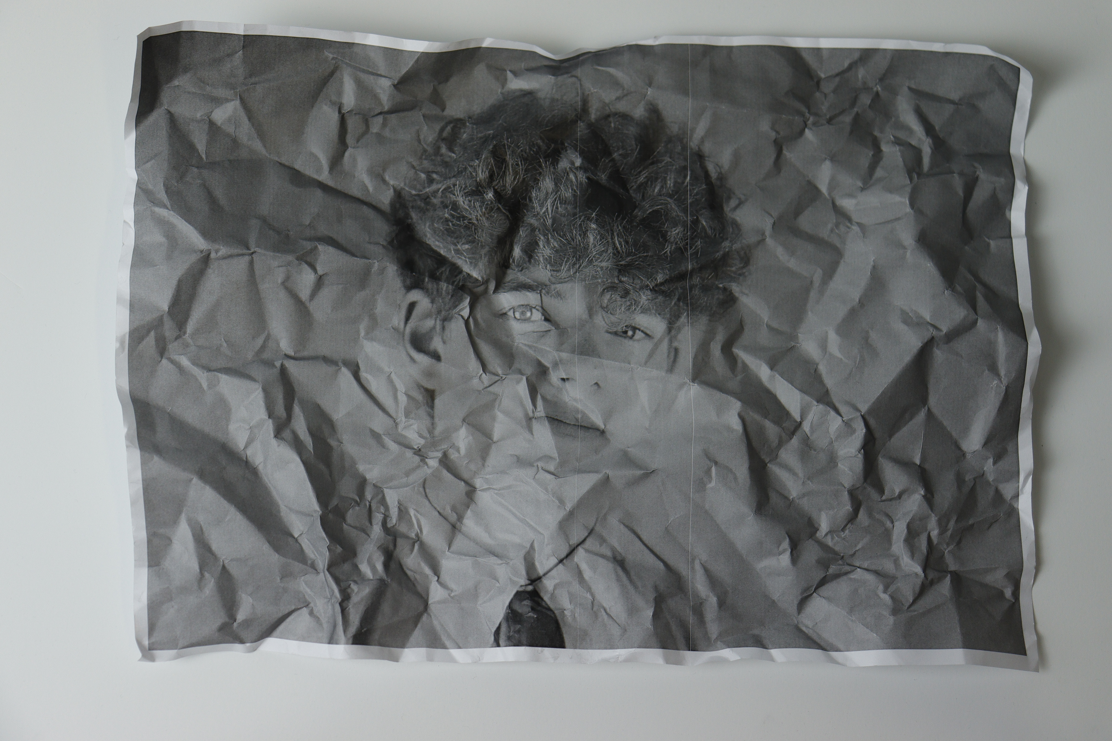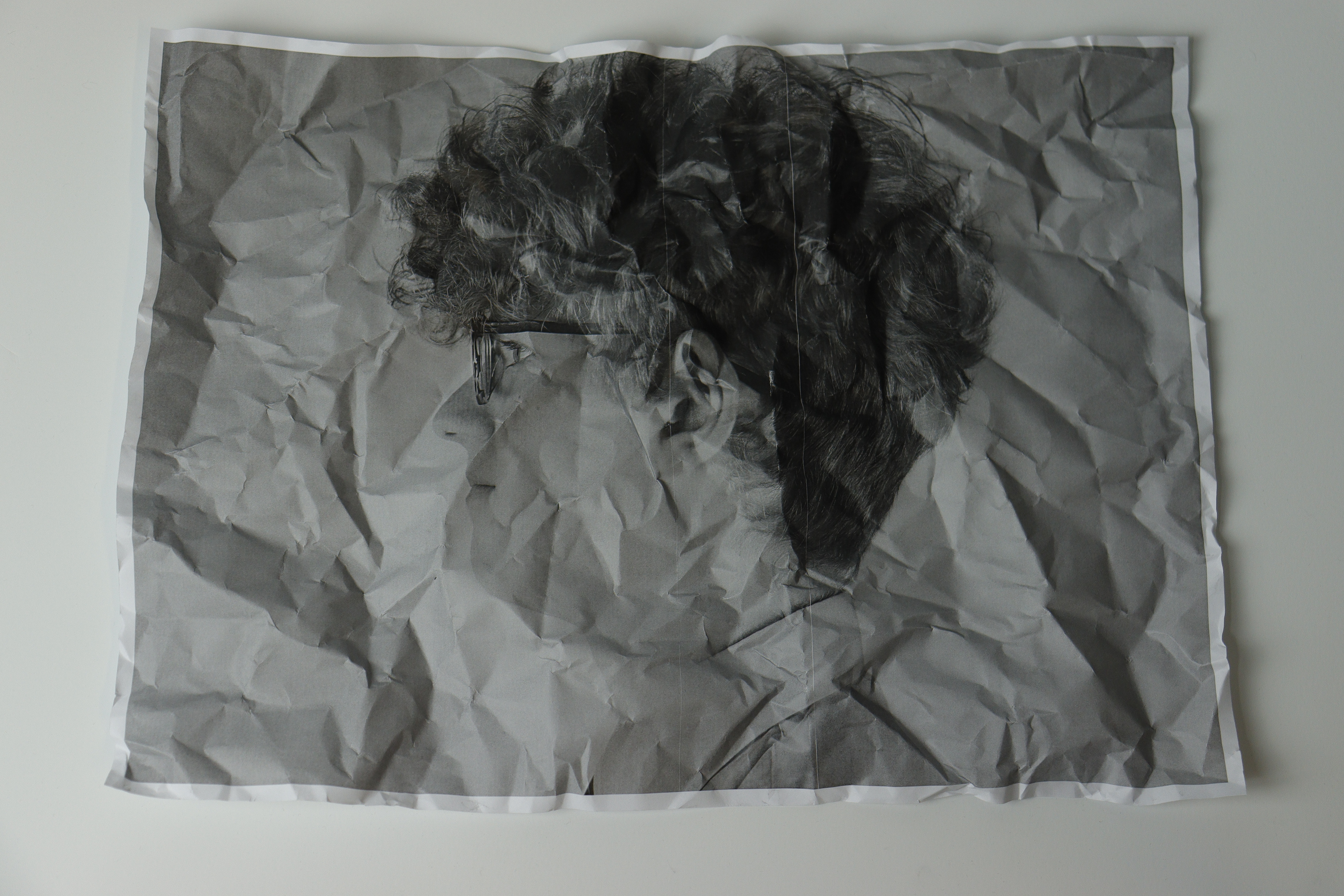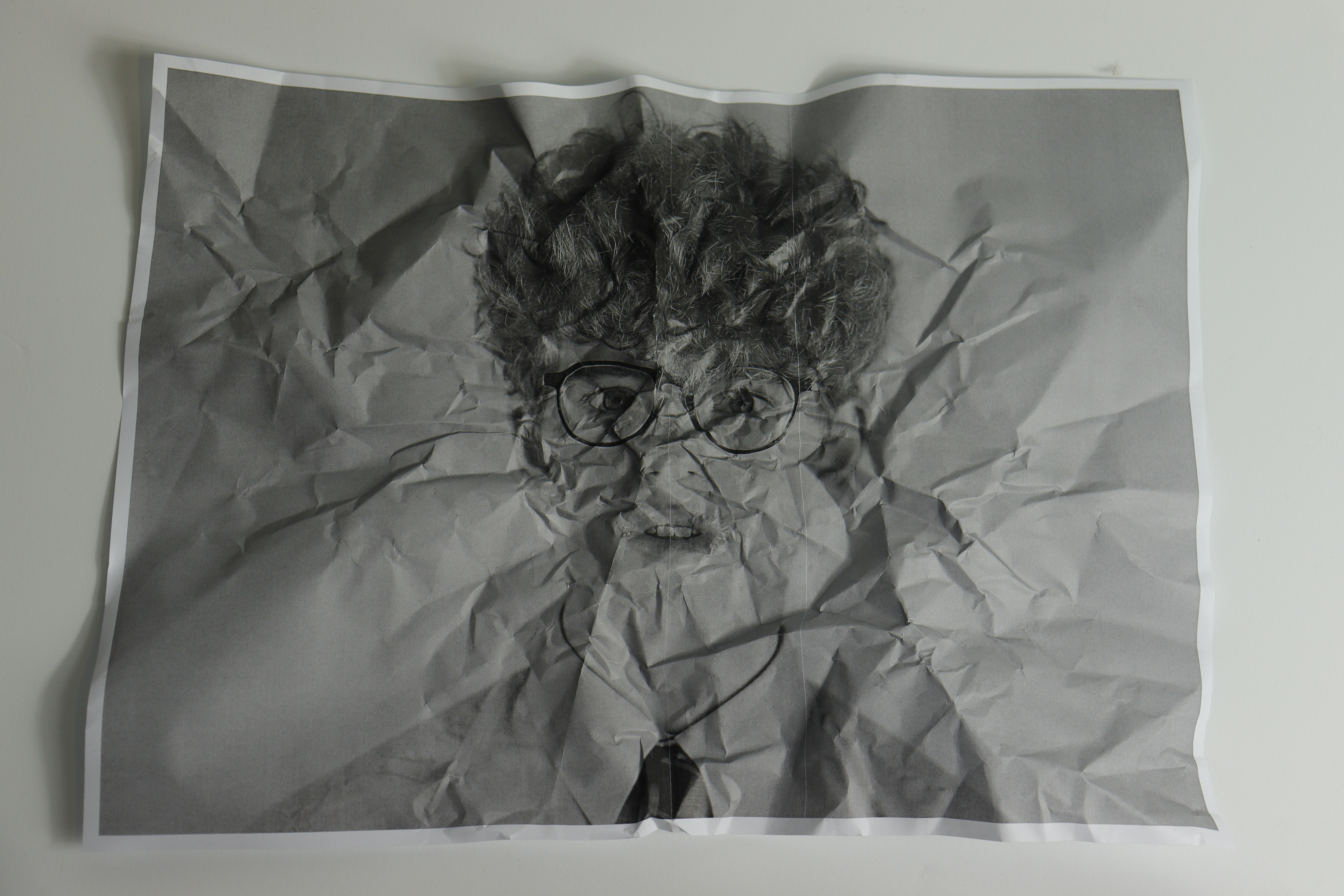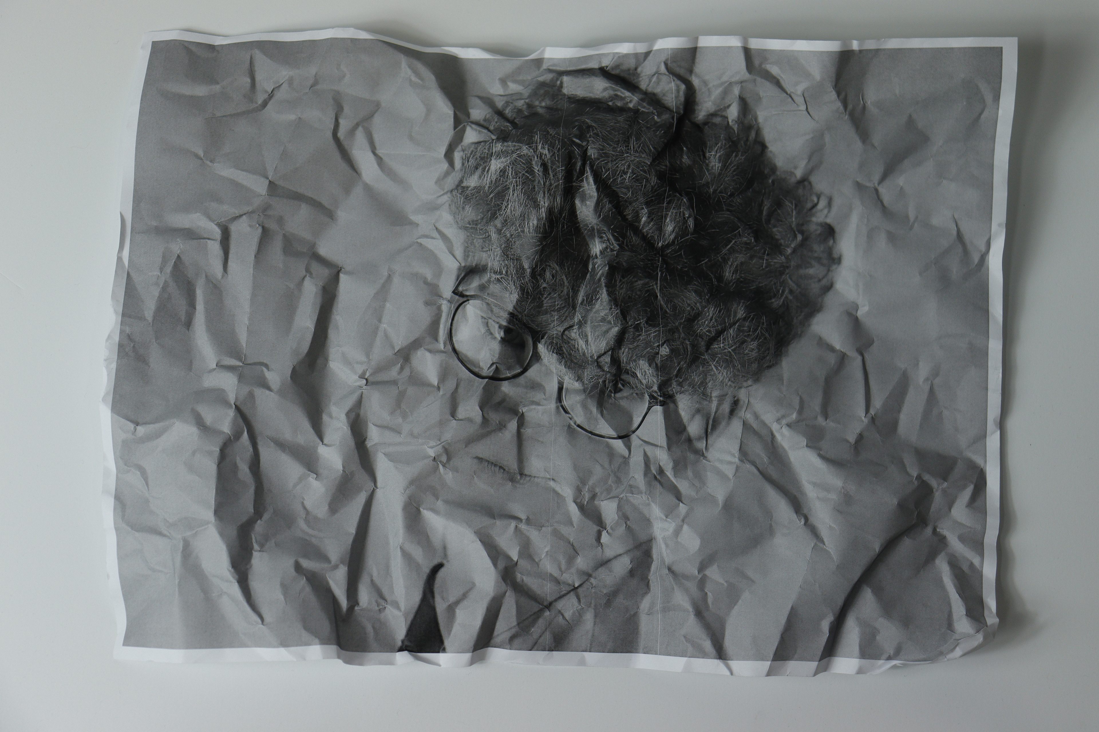 The works have a simple composition: The subject is in the centre and is often placed against a dark or black background. This sharp contrast helps draw your attention to the subject and serves to highlight the crumples in the paper. These crumples create a very interesting texture which plays a key role in the distortion of the image.